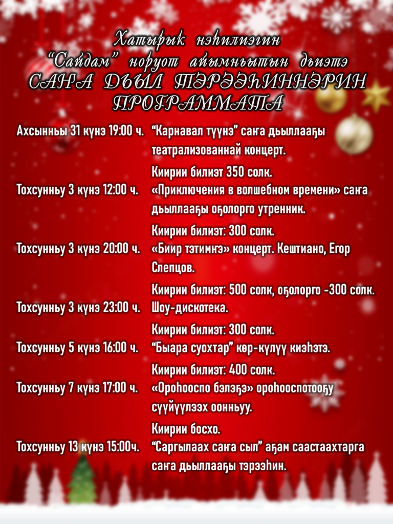 Хатырык нэһилиэгин саргылаах саҥа сылы көрсөр тэрээһиннэрэ Опубликовано 23.12.202523.12.2025Автор saidam 0